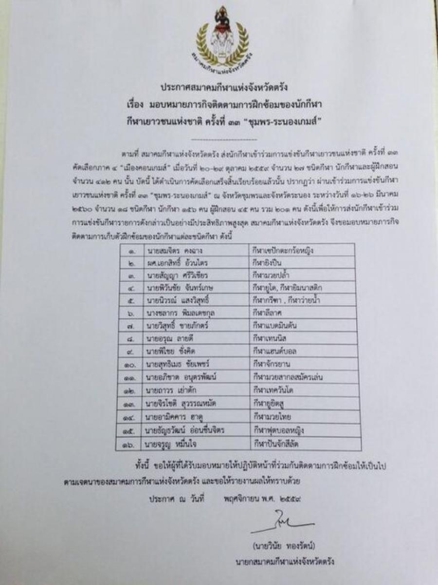 ประกาศสมาคมกีฬาแห่งจังหวัดตรัง
